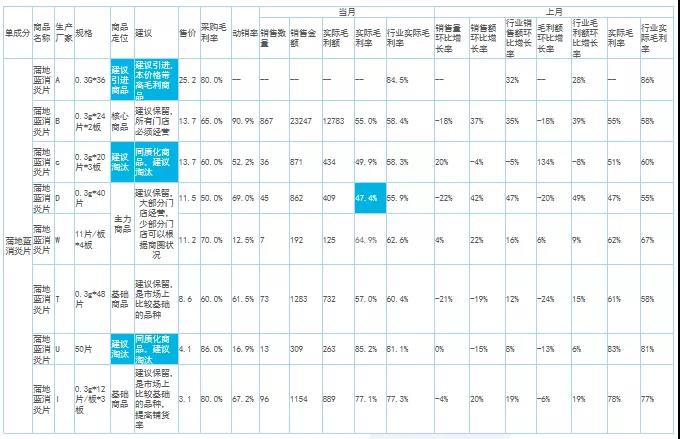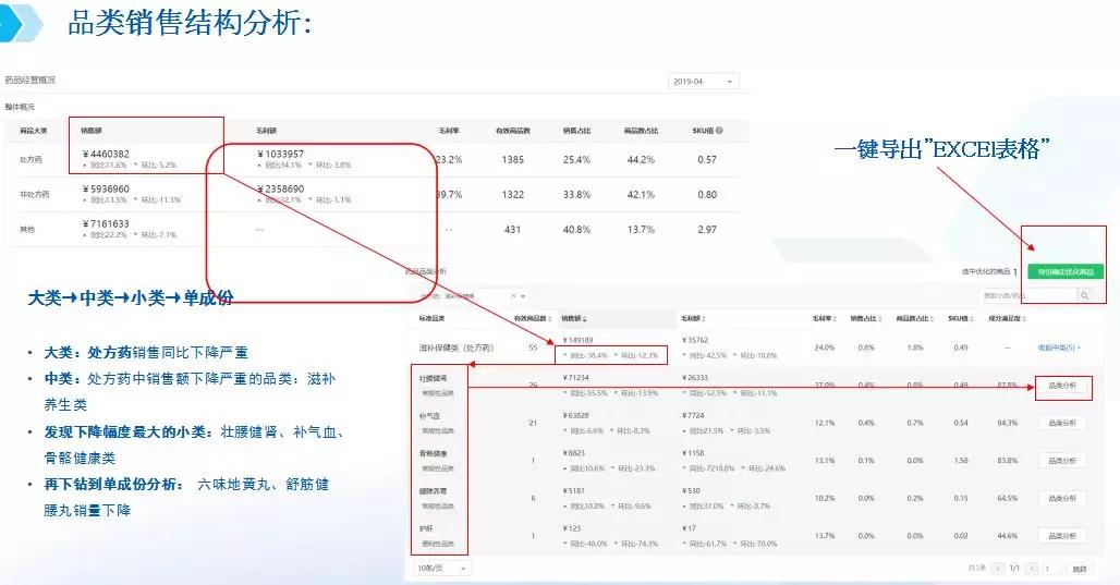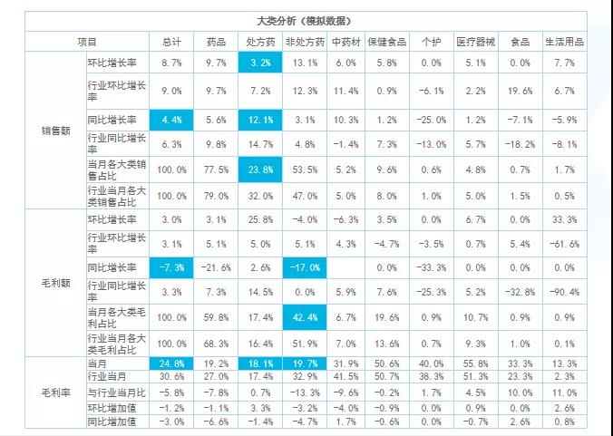大類分析主要看整體銷售結構,找出核心大類的增長機會點。例如,這組數(shù)據(jù)中不管是整體毛利率還是銷售額增長率,都低于行業(yè)均值。細分處方藥、非處方藥及中藥等品類的情況可以看出,處方藥的同環(huán)比銷售額以及銷售占比均低于行業(yè)值,而毛利率卻高于行業(yè)值?梢缘贸觯瓿踔贫ㄌ幏剿帪楹诵脑鲩L大類的策略沒有落地。所以,接下來做中類、小類跟單成分分析的時候需要進行針對性監(jiān)控。