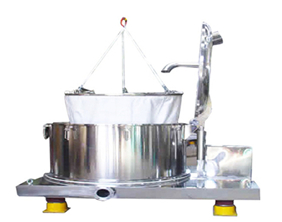 PD系列吊袋離心機結(jié)合國情自行設(shè)計制造的新型離心機,其驅(qū)動電機既可采用離合器啟動,也可由變頻調(diào)速系統(tǒng)控制,啟動平穩(wěn),通過三角帶將動力傳遞給轉(zhuǎn)鼓,帶動轉(zhuǎn)鼓使轉(zhuǎn)鼓自身軸線高速旋轉(zhuǎn),形成離心力場,待分離的物料經(jīng)上部加料管進入高速旋轉(zhuǎn)的轉(zhuǎn)鼓內(nèi),在離心機力場作用下,物料均布在轉(zhuǎn)鼓壁上進行離心過程,液相透過固相物料及濾袋的縫隙,經(jīng)轉(zhuǎn)鼓孔甩至機殼空腔,從底盤出液口排出,固相物料則被截留在濾袋內(nèi)。停機后,開啟機蓋(借助特殊設(shè)計的平衡助力裝置),拔出蘭蓋鎖緊栓,用特制的吊具將濾餅吊出機外設(shè)定地點卸料,即完成一個工作循環(huán)。機蓋上配有洗滌管,可以對物料進行洗滌。